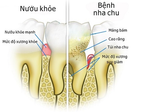 Bệnh nha chu là hiện tượng viêm nhiễm các vùng mô xung quanh chân răng. Khi nướu và các mô xung quanh chân răng bị viêm nhiễm, chúng sẽ tách ra khỏi chân răng, chân răng không còn lớp nâng đỡ và bảo vệ, ở xương chân răng cũng bị viêm nhiễm dẫn đến tiêu xương hàm. Cuối cùng là lung lay chân răng và mất răng nếu không điều trị kịp thời.